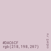 Цвет #DAC6CF в цветовой модели RGB обозначается тремя октетами (218, 198, 207) в десятичном формате и #DAC6CF в шестнадцатиричном (hex) формате, которые являются интенсивностью красного 218 (hex DA), интенсивность зелёного 198 (hex C6) и интенсивность синего 207 (hex CF).