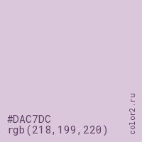 Цвет #DAC7DC в цветовой модели RGB обозначается тремя октетами (218, 199, 220) в десятичном формате и #DAC7DC в шестнадцатиричном (hex) формате, которые являются интенсивностью красного 218 (hex DA), интенсивность зелёного 199 (hex C7) и интенсивность синего 220 (hex DC).