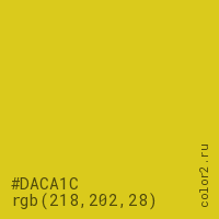 Цвет #DACA1C в цветовой модели RGB обозначается тремя октетами (218, 202, 28) в десятичном формате и #DACA1C в шестнадцатиричном (hex) формате, которые являются интенсивностью красного 218 (hex DA), интенсивность зелёного 202 (hex CA) и интенсивность синего 28 (hex 1C).