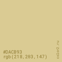 Цвет #DACB93 в цветовой модели RGB обозначается тремя октетами (218, 203, 147) в десятичном формате и #DACB93 в шестнадцатиричном (hex) формате, которые являются интенсивностью красного 218 (hex DA), интенсивность зелёного 203 (hex CB) и интенсивность синего 147 (hex 93).