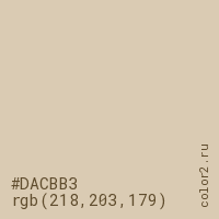 Цвет #DACBB3 в цветовой модели RGB обозначается тремя октетами (218, 203, 179) в десятичном формате и #DACBB3 в шестнадцатиричном (hex) формате, которые являются интенсивностью красного 218 (hex DA), интенсивность зелёного 203 (hex CB) и интенсивность синего 179 (hex B3).