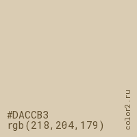 Цвет #DACCB3 в цветовой модели RGB обозначается тремя октетами (218, 204, 179) в десятичном формате и #DACCB3 в шестнадцатиричном (hex) формате, которые являются интенсивностью красного 218 (hex DA), интенсивность зелёного 204 (hex CC) и интенсивность синего 179 (hex B3).