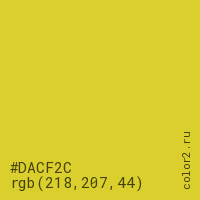 Цвет #DACF2C в цветовой модели RGB обозначается тремя октетами (218, 207, 44) в десятичном формате и #DACF2C в шестнадцатиричном (hex) формате, которые являются интенсивностью красного 218 (hex DA), интенсивность зелёного 207 (hex CF) и интенсивность синего 44 (hex 2C).