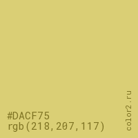 Цвет #DACF75 в цветовой модели RGB обозначается тремя октетами (218, 207, 117) в десятичном формате и #DACF75 в шестнадцатиричном (hex) формате, которые являются интенсивностью красного 218 (hex DA), интенсивность зелёного 207 (hex CF) и интенсивность синего 117 (hex 75).