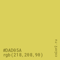Цвет #DAD05A в цветовой модели RGB обозначается тремя октетами (218, 208, 90) в десятичном формате и #DAD05A в шестнадцатиричном (hex) формате, которые являются интенсивностью красного 218 (hex DA), интенсивность зелёного 208 (hex D0) и интенсивность синего 90 (hex 5A).