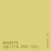 Цвет #DAD07D в цветовой модели RGB обозначается тремя октетами (218, 208, 125) в десятичном формате и #DAD07D в шестнадцатиричном (hex) формате, которые являются интенсивностью красного 218 (hex DA), интенсивность зелёного 208 (hex D0) и интенсивность синего 125 (hex 7D).