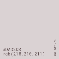 Цвет #DAD2D3 в цветовой модели RGB обозначается тремя октетами (218, 210, 211) в десятичном формате и #DAD2D3 в шестнадцатиричном (hex) формате, которые являются интенсивностью красного 218 (hex DA), интенсивность зелёного 210 (hex D2) и интенсивность синего 211 (hex D3).