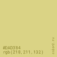Цвет #DAD384 в цветовой модели RGB обозначается тремя октетами (218, 211, 132) в десятичном формате и #DAD384 в шестнадцатиричном (hex) формате, которые являются интенсивностью красного 218 (hex DA), интенсивность зелёного 211 (hex D3) и интенсивность синего 132 (hex 84).