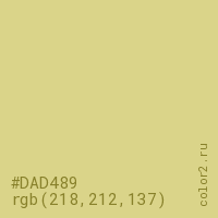 Цвет #DAD489 в цветовой модели RGB обозначается тремя октетами (218, 212, 137) в десятичном формате и #DAD489 в шестнадцатиричном (hex) формате, которые являются интенсивностью красного 218 (hex DA), интенсивность зелёного 212 (hex D4) и интенсивность синего 137 (hex 89).