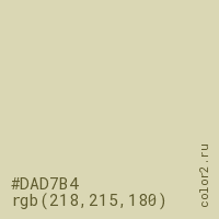 Цвет #DAD7B4 в цветовой модели RGB обозначается тремя октетами (218, 215, 180) в десятичном формате и #DAD7B4 в шестнадцатиричном (hex) формате, которые являются интенсивностью красного 218 (hex DA), интенсивность зелёного 215 (hex D7) и интенсивность синего 180 (hex B4).