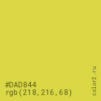 Цвет #DAD844 в цветовой модели RGB обозначается тремя октетами (218, 216, 68) в десятичном формате и #DAD844 в шестнадцатиричном (hex) формате, которые являются интенсивностью красного 218 (hex DA), интенсивность зелёного 216 (hex D8) и интенсивность синего 68 (hex 44).