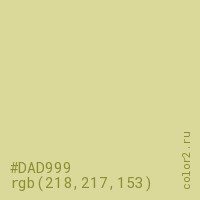 Цвет #DAD999 в цветовой модели RGB обозначается тремя октетами (218, 217, 153) в десятичном формате и #DAD999 в шестнадцатиричном (hex) формате, которые являются интенсивностью красного 218 (hex DA), интенсивность зелёного 217 (hex D9) и интенсивность синего 153 (hex 99).