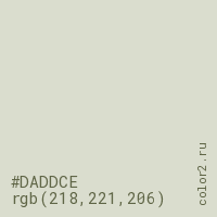 Цвет #DADDCE в цветовой модели RGB обозначается тремя октетами (218, 221, 206) в десятичном формате и #DADDCE в шестнадцатиричном (hex) формате, которые являются интенсивностью красного 218 (hex DA), интенсивность зелёного 221 (hex DD) и интенсивность синего 206 (hex CE).