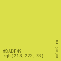 Цвет #DADF49 в цветовой модели RGB обозначается тремя октетами (218, 223, 73) в десятичном формате и #DADF49 в шестнадцатиричном (hex) формате, которые являются интенсивностью красного 218 (hex DA), интенсивность зелёного 223 (hex DF) и интенсивность синего 73 (hex 49).