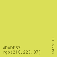 Цвет #DADF57 в цветовой модели RGB обозначается тремя октетами (218, 223, 87) в десятичном формате и #DADF57 в шестнадцатиричном (hex) формате, которые являются интенсивностью красного 218 (hex DA), интенсивность зелёного 223 (hex DF) и интенсивность синего 87 (hex 57).