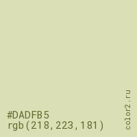 Цвет #DADFB5 в цветовой модели RGB обозначается тремя октетами (218, 223, 181) в десятичном формате и #DADFB5 в шестнадцатиричном (hex) формате, которые являются интенсивностью красного 218 (hex DA), интенсивность зелёного 223 (hex DF) и интенсивность синего 181 (hex B5).