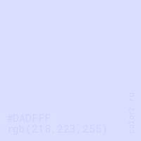 Цвет #DADFFF в цветовой модели RGB обозначается тремя октетами (218, 223, 255) в десятичном формате и #DADFFF в шестнадцатиричном (hex) формате, которые являются интенсивностью красного 218 (hex DA), интенсивность зелёного 223 (hex DF) и интенсивность синего 255 (hex FF).
