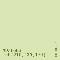 Цвет #DAE6B3 в цветовой модели RGB обозначается тремя октетами (218, 230, 179) в десятичном формате и #DAE6B3 в шестнадцатиричном (hex) формате, которые являются интенсивностью красного 218 (hex DA), интенсивность зелёного 230 (hex E6) и интенсивность синего 179 (hex B3).