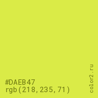 Цвет #DAEB47 в цветовой модели RGB обозначается тремя октетами (218, 235, 71) в десятичном формате и #DAEB47 в шестнадцатиричном (hex) формате, которые являются интенсивностью красного 218 (hex DA), интенсивность зелёного 235 (hex EB) и интенсивность синего 71 (hex 47).