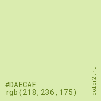 Цвет #DAECAF в цветовой модели RGB обозначается тремя октетами (218, 236, 175) в десятичном формате и #DAECAF в шестнадцатиричном (hex) формате, которые являются интенсивностью красного 218 (hex DA), интенсивность зелёного 236 (hex EC) и интенсивность синего 175 (hex AF).