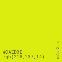 Цвет #DAED0E в цветовой модели RGB обозначается тремя октетами (218, 237, 14) в десятичном формате и #DAED0E в шестнадцатиричном (hex) формате, которые являются интенсивностью красного 218 (hex DA), интенсивность зелёного 237 (hex ED) и интенсивность синего 14 (hex 0E).