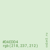 Цвет #DAEDD4 в цветовой модели RGB обозначается тремя октетами (218, 237, 212) в десятичном формате и #DAEDD4 в шестнадцатиричном (hex) формате, которые являются интенсивностью красного 218 (hex DA), интенсивность зелёного 237 (hex ED) и интенсивность синего 212 (hex D4).