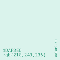 Цвет #DAF3EC в цветовой модели RGB обозначается тремя октетами (218, 243, 236) в десятичном формате и #DAF3EC в шестнадцатиричном (hex) формате, которые являются интенсивностью красного 218 (hex DA), интенсивность зелёного 243 (hex F3) и интенсивность синего 236 (hex EC).