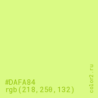 Цвет #DAFA84 в цветовой модели RGB обозначается тремя октетами (218, 250, 132) в десятичном формате и #DAFA84 в шестнадцатиричном (hex) формате, которые являются интенсивностью красного 218 (hex DA), интенсивность зелёного 250 (hex FA) и интенсивность синего 132 (hex 84).
