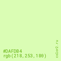 Цвет #DAFDB4 в цветовой модели RGB обозначается тремя октетами (218, 253, 180) в десятичном формате и #DAFDB4 в шестнадцатиричном (hex) формате, которые являются интенсивностью красного 218 (hex DA), интенсивность зелёного 253 (hex FD) и интенсивность синего 180 (hex B4).