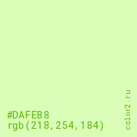 Цвет #DAFEB8 в цветовой модели RGB обозначается тремя октетами (218, 254, 184) в десятичном формате и #DAFEB8 в шестнадцатиричном (hex) формате, которые являются интенсивностью красного 218 (hex DA), интенсивность зелёного 254 (hex FE) и интенсивность синего 184 (hex B8).