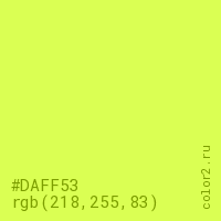 Цвет #DAFF53 в цветовой модели RGB обозначается тремя октетами (218, 255, 83) в десятичном формате и #DAFF53 в шестнадцатиричном (hex) формате, которые являются интенсивностью красного 218 (hex DA), интенсивность зелёного 255 (hex FF) и интенсивность синего 83 (hex 53).