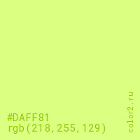 Цвет #DAFF81 в цветовой модели RGB обозначается тремя октетами (218, 255, 129) в десятичном формате и #DAFF81 в шестнадцатиричном (hex) формате, которые являются интенсивностью красного 218 (hex DA), интенсивность зелёного 255 (hex FF) и интенсивность синего 129 (hex 81).