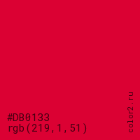 Цвет #DB0133 в цветовой модели RGB обозначается тремя октетами (219, 1, 51) в десятичном формате и #DB0133 в шестнадцатиричном (hex) формате, которые являются интенсивностью красного 219 (hex DB), интенсивность зелёного 1 (hex 01) и интенсивность синего 51 (hex 33).