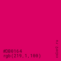 Цвет #DB0164 в цветовой модели RGB обозначается тремя октетами (219, 1, 100) в десятичном формате и #DB0164 в шестнадцатиричном (hex) формате, которые являются интенсивностью красного 219 (hex DB), интенсивность зелёного 1 (hex 01) и интенсивность синего 100 (hex 64).