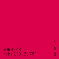 Цвет #DB024B в цветовой модели RGB обозначается тремя октетами (219, 2, 75) в десятичном формате и #DB024B в шестнадцатиричном (hex) формате, которые являются интенсивностью красного 219 (hex DB), интенсивность зелёного 2 (hex 02) и интенсивность синего 75 (hex 4B).