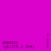 Цвет #DB03CC в цветовой модели RGB обозначается тремя октетами (219, 3, 204) в десятичном формате и #DB03CC в шестнадцатиричном (hex) формате, которые являются интенсивностью красного 219 (hex DB), интенсивность зелёного 3 (hex 03) и интенсивность синего 204 (hex CC).