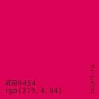 Цвет #DB0454 в цветовой модели RGB обозначается тремя октетами (219, 4, 84) в десятичном формате и #DB0454 в шестнадцатиричном (hex) формате, которые являются интенсивностью красного 219 (hex DB), интенсивность зелёного 4 (hex 04) и интенсивность синего 84 (hex 54).
