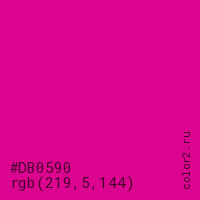 Цвет #DB0590 в цветовой модели RGB обозначается тремя октетами (219, 5, 144) в десятичном формате и #DB0590 в шестнадцатиричном (hex) формате, которые являются интенсивностью красного 219 (hex DB), интенсивность зелёного 5 (hex 05) и интенсивность синего 144 (hex 90).