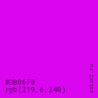 Цвет #DB06F0 в цветовой модели RGB обозначается тремя октетами (219, 6, 240) в десятичном формате и #DB06F0 в шестнадцатиричном (hex) формате, которые являются интенсивностью красного 219 (hex DB), интенсивность зелёного 6 (hex 06) и интенсивность синего 240 (hex F0).