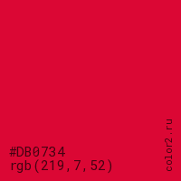 Цвет #DB0734 в цветовой модели RGB обозначается тремя октетами (219, 7, 52) в десятичном формате и #DB0734 в шестнадцатиричном (hex) формате, которые являются интенсивностью красного 219 (hex DB), интенсивность зелёного 7 (hex 07) и интенсивность синего 52 (hex 34).