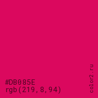 Цвет #DB085E в цветовой модели RGB обозначается тремя октетами (219, 8, 94) в десятичном формате и #DB085E в шестнадцатиричном (hex) формате, которые являются интенсивностью красного 219 (hex DB), интенсивность зелёного 8 (hex 08) и интенсивность синего 94 (hex 5E).