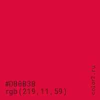 Цвет #DB0B3B в цветовой модели RGB обозначается тремя октетами (219, 11, 59) в десятичном формате и #DB0B3B в шестнадцатиричном (hex) формате, которые являются интенсивностью красного 219 (hex DB), интенсивность зелёного 11 (hex 0B) и интенсивность синего 59 (hex 3B).