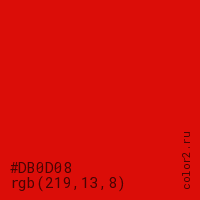 Цвет #DB0D08 в цветовой модели RGB обозначается тремя октетами (219, 13, 8) в десятичном формате и #DB0D08 в шестнадцатиричном (hex) формате, которые являются интенсивностью красного 219 (hex DB), интенсивность зелёного 13 (hex 0D) и интенсивность синего 8 (hex 08).
