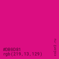 Цвет #DB0D81 в цветовой модели RGB обозначается тремя октетами (219, 13, 129) в десятичном формате и #DB0D81 в шестнадцатиричном (hex) формате, которые являются интенсивностью красного 219 (hex DB), интенсивность зелёного 13 (hex 0D) и интенсивность синего 129 (hex 81).