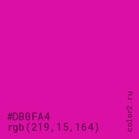 Цвет #DB0FA4 в цветовой модели RGB обозначается тремя октетами (219, 15, 164) в десятичном формате и #DB0FA4 в шестнадцатиричном (hex) формате, которые являются интенсивностью красного 219 (hex DB), интенсивность зелёного 15 (hex 0F) и интенсивность синего 164 (hex A4).