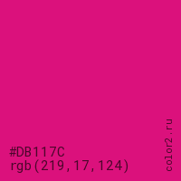Цвет #DB117C в цветовой модели RGB обозначается тремя октетами (219, 17, 124) в десятичном формате и #DB117C в шестнадцатиричном (hex) формате, которые являются интенсивностью красного 219 (hex DB), интенсивность зелёного 17 (hex 11) и интенсивность синего 124 (hex 7C).