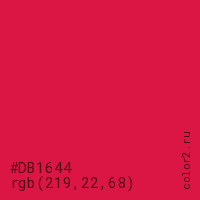 Цвет #DB1644 в цветовой модели RGB обозначается тремя октетами (219, 22, 68) в десятичном формате и #DB1644 в шестнадцатиричном (hex) формате, которые являются интенсивностью красного 219 (hex DB), интенсивность зелёного 22 (hex 16) и интенсивность синего 68 (hex 44).