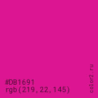 Цвет #DB1691 в цветовой модели RGB обозначается тремя октетами (219, 22, 145) в десятичном формате и #DB1691 в шестнадцатиричном (hex) формате, которые являются интенсивностью красного 219 (hex DB), интенсивность зелёного 22 (hex 16) и интенсивность синего 145 (hex 91).