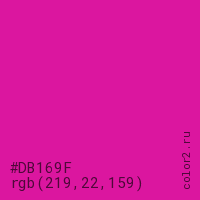 Цвет #DB169F в цветовой модели RGB обозначается тремя октетами (219, 22, 159) в десятичном формате и #DB169F в шестнадцатиричном (hex) формате, которые являются интенсивностью красного 219 (hex DB), интенсивность зелёного 22 (hex 16) и интенсивность синего 159 (hex 9F).