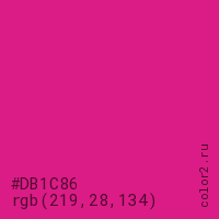 Цвет #DB1C86 в цветовой модели RGB обозначается тремя октетами (219, 28, 134) в десятичном формате и #DB1C86 в шестнадцатиричном (hex) формате, которые являются интенсивностью красного 219 (hex DB), интенсивность зелёного 28 (hex 1C) и интенсивность синего 134 (hex 86).